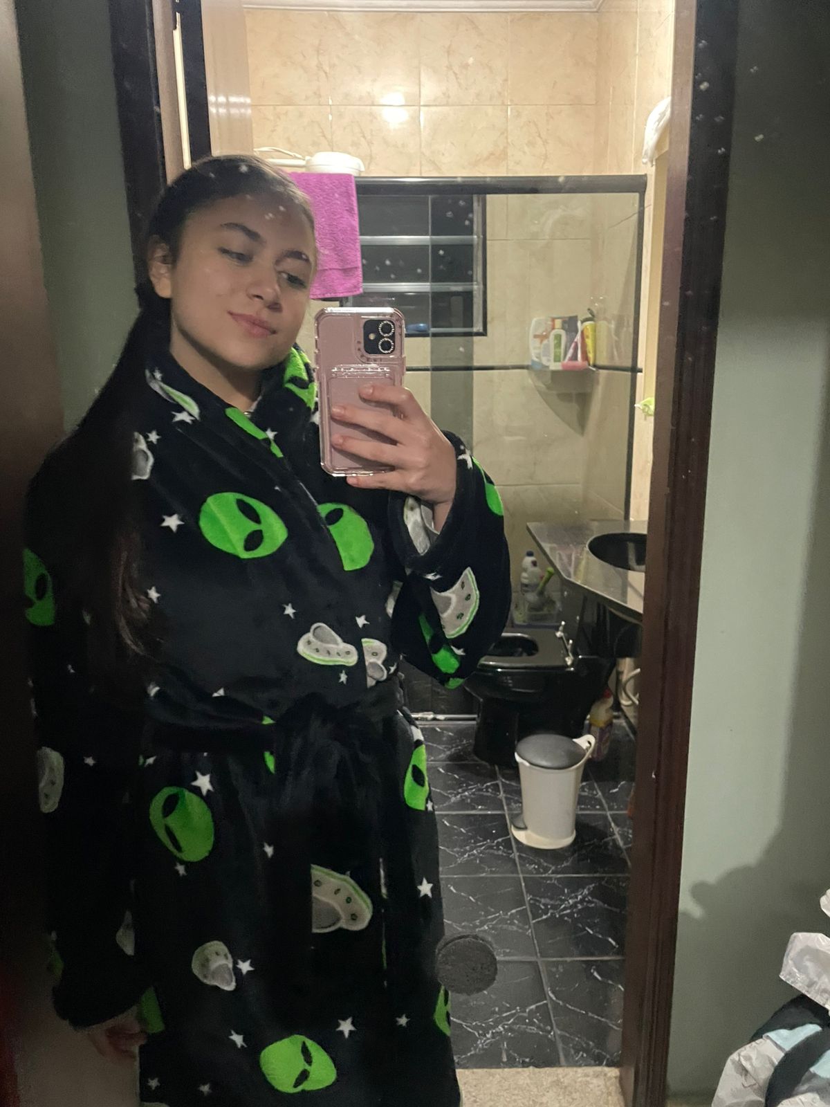 Confeccionado em malha fleece super macia, ele é a escolha perfeita para se manter aquecido e relaxado depois de um longo dia ou durante os fins de semana. Com uma estampa divertida de temática extraterrestre, esta peça adiciona um toque de personalidade à sua roupa de dormir.